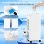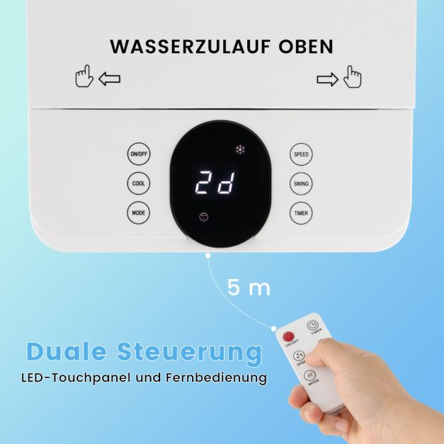 - 2 možnosti upravljanja in dvojni rezervoar za vodo: Prenosni hladilnik zraka je opremljen z LED ploščo na dotik in daljinskim upravljalnikom, tako da lahko preprosto prilagodite vse nastavitve. Poleg tega je oblika z dvema rezervoarjema za vodo na vrhu in na dnu primerna za dolivanje vode. Indikator nivoja vode vas opomni, da vodo pravočasno napolnite.